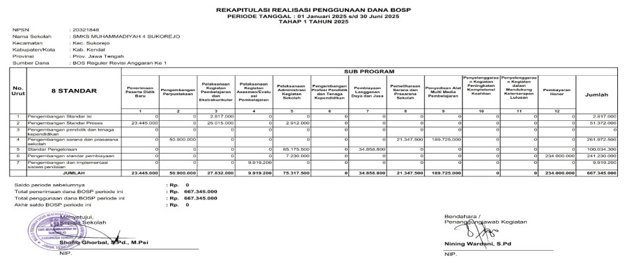 Sebagai bentuk transparansi dan akuntabilitas pengelolaan dana Bantuan Operasional Satuan Pendidikan (BOSP), SMK Muhammadiyah 04 Sukorejo – Kendal menyampaikan Rekapitulasi Realisasi Penggunaan Dana BOSP untuk Tahap 1 Tahun 2025.